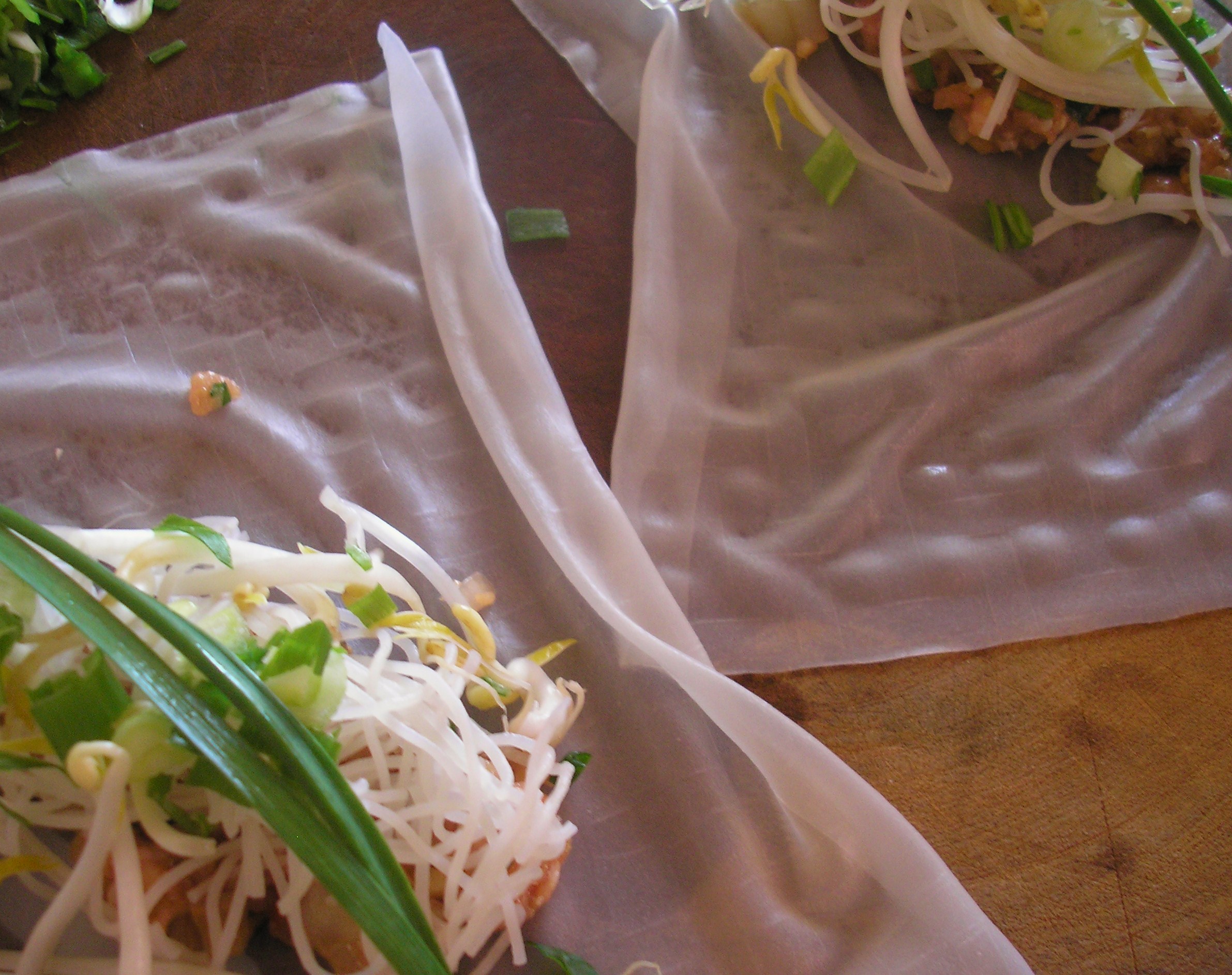 Soak the rice paper sheets in warm water a couple at a time. This should only take about thirty seconds. Fill with a little of the pork mixture, topped with some vermicelli noodles, bean shoots and I put a garlic chive (you could use a piece of split spring onion or a fresh mint leaf) on top to make it look pretty. Turn over the edge nearest to you and start rolling, folding in the edges when you get half way up the sheet. Because these ones are going to be deep fried try to make sure they are really well sealed. If in doubt it is all right to wrap with a second sheet, just remember you will need more sheets and you may need to let the rolls rest on your board fro 20 minutes or so to dry them out a bit. I then deep fried them in batches in hot oil. They took about ten minutes or until they start to lightly brown (don’t expect them to go as brown as ordinary spring rolls, just make sure they are crisp). Drain well on a rack.