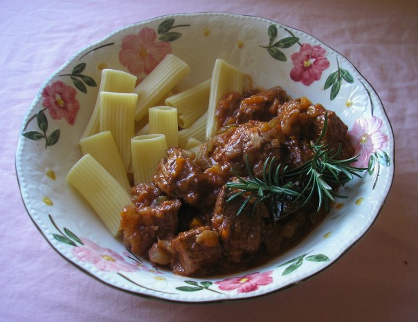 Finely dice the onion, fennel, celery and carrot. Chop the bacon or pancetta. Dust the meat with the flour. Heat some of the oil in a large heavy based saucepan. Brown the meat in batches. Remove and set aside. Add a little more oil to the pan and gently fry the onion, fennel, celery, carrot, bacon and garlic. Add the dried oregano, bay leaf, all spice, orange zest and tomato paste. Fry for 1 min. Add the red wine and cook for a further 2 mins. Add the tomatoes, beef stock and 1 cup water. Return the meat to the pan and season with pepper – don’t add salt at this point as the bacon and the beef stock can be salty, you can adjust your seasoning to taste at the end of the cooking time. Bring to the boil, cover and reduce to a low simmer. Cook for two hours stirring occasionally. When the beef is almost falling apart, remove lid and reduce sauce for 15 mins. Make sure there is still plenty of sauce. Serve over rigatoni or large penne pasta.