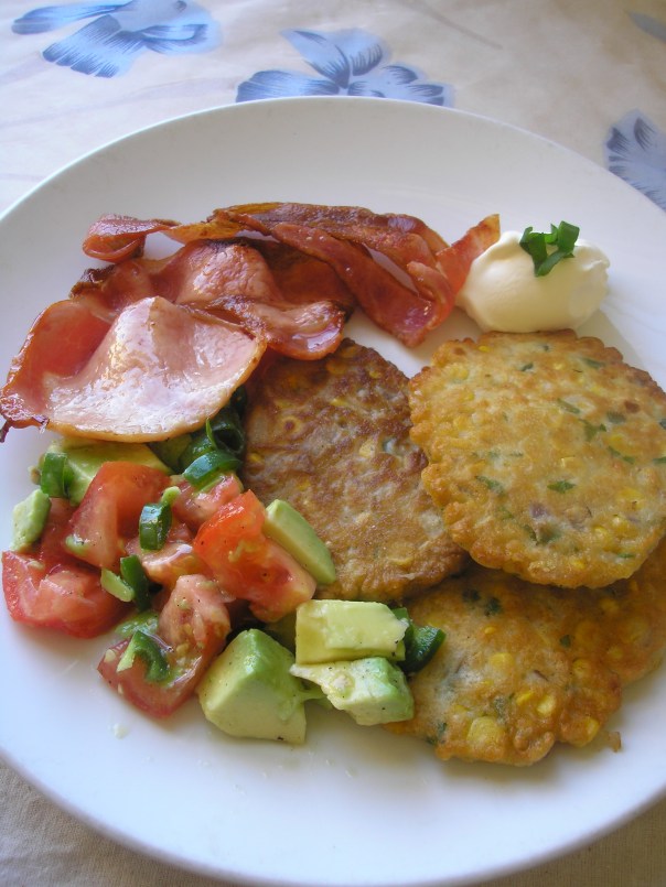 With corn in season at the moment I am always looking for different ways to serve it. I always buy my corn in the husk and if it is really fresh, it needs little more than a quick boil, a bit of salt, pepper and butter and it is ready to be eaten. Corn on the cob can, however, seem a little boring after a while which is why I make corn salsa* and corn fritters. Luke Nguyen’s prawn and corn fritters that I cooked in May 2011** were more of a deep fried fritter, these ones are simpler and are more like corn pikelets or hotcakes. They are delicious served with crisp grilled bacon for breakfast but they can be eaten at any time of day.