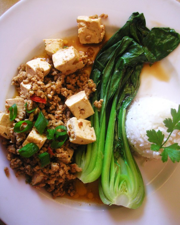 Many people think of eating tofu as a sort of penance. Yes it’s good for you, low in fat, high in protein – particularly good for women – but it can be very bland. If you are not vegetarian or vegan you might force yourself to eat some once a month just so you can feel virtuous. In the end, though, it is tofu’s very blandness that makes it such a wonderful sponge for tasty sauces. Chinese cooks love tofu, one of their favourite dishes is a combination of pork mince and tofu in a delicious spicy Sichuan sauce called Ma Po Tofu. Ma (mazi) means someone who is pockmarked so the dish is often translated as ‘pockmarked lady’s face tofu’. Legend has it that this is because the old widow who first made the dish was disfigured with pockmarks. I don’t know if this is the case or if the name comes from the appearance of the dish. Whatever the true explanation it is certainly an interesting name! Here’s the recipe for the spicy version I made.