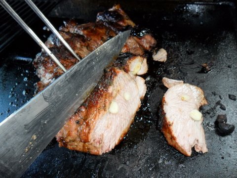 Dad then got the barbecue nice and hot and put the lamb on, skin side down.  When seared on that side, he turned it over and did the other side – this took about 15 mins.  He then turned the barbecue down and closed the lid, cooking the meat for about another 30-40 mins.  He then turned the barbecue off and allowed the meat to rest for 15 mins.  The result was beautiful, tender lamb.