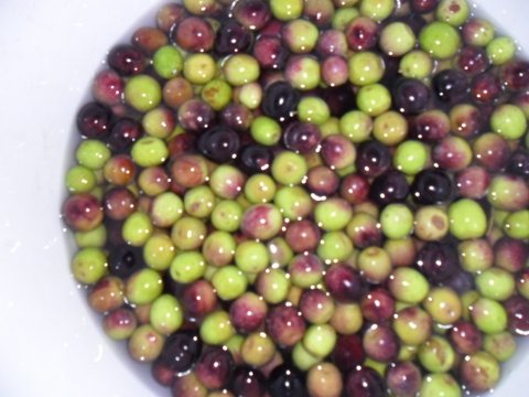To cure the olives*  they soak them in plain water for 40 days, changing the water every day.  This helps to remove some of the bitterness.  They then pour over a warm 8% salt solution and leave them, covered,  for 2 days.  The olives are then divided into jars and covered again with an 8% salt solution.  To finish they are covered with an 2-3 mm film of olive oil and must be left for two weeks  before eating.  Mum and Dad keep the jars in the fridge but this may only be necessary after the jars have been opened.  Of course you must use clean, sterile jars to begin with.  The olives can be served marinated in olive oil and lemon juice with a bit of lemon rind, chilli flakes, garlic and herbs.