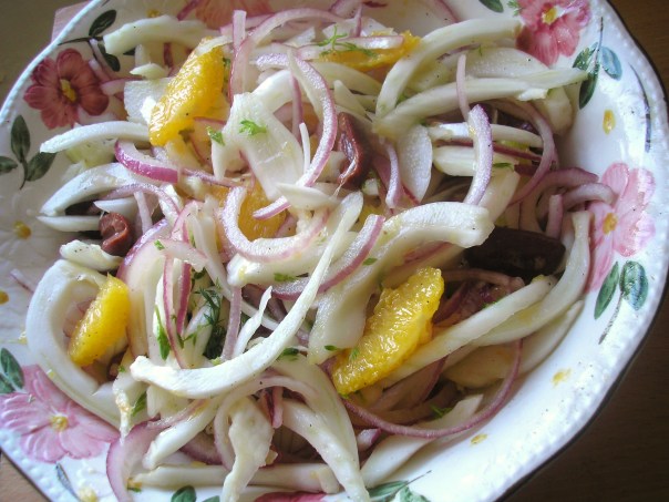 Finocchio or Florence fennel is a different variety to the fennel plants we see growing around railway sidings and creeks. While this wild fennel still yields seeds, fronds and flowers that are edible, Florence fennel forms a bulb-like growth at the bottom and this is the part that is eaten. Here in Australia fennel is in season in winter so look for cheap, fresh fennel bulbs then. Fennel is surprisingly versatile though some people find the anise flavour to be a bit of an acquired taste. It works well roasted or fried and it is good finely diced and fried along with celery, carrot and onion at the beginning of a ragu or bolgnese sauce. It can also be eaten raw with a citrus dressing. Served in this way, it is a fresh accompaniment to all those heavy winter dishes.