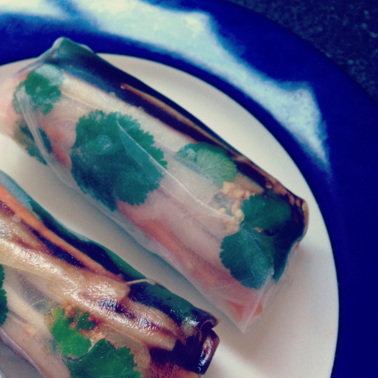 Heat a little oil in a heavy based frypan, add the chili flakes and garlic and fry for a minute, add the soft tofu and the five spice powder. Stir to ‘scramble’ the tofu and cook until well incorporated. Stir through the spring onions and soy sauce and set aside to cool. To compile the rolls: Have a bowl of warm water and a wooden board at the ready. Have your other ingredients and your tofu nearby. Wet a rice paper sheet in the warm water and lay it out on your board, Smear a little Hoi Sin sauce on the sheet and then place a a couple of coriander leaves and a small amount of rice vermicelli noodles in the middle. Top with a small amount of all the other ingredients making sure you have enough for all twelve rolls. Turn the sides of the sheet in and then roll up from the bottom finishing with the seam side down. Place on a plate and continue until all the rolls are done. Serve with a dipping sauce of your choice.